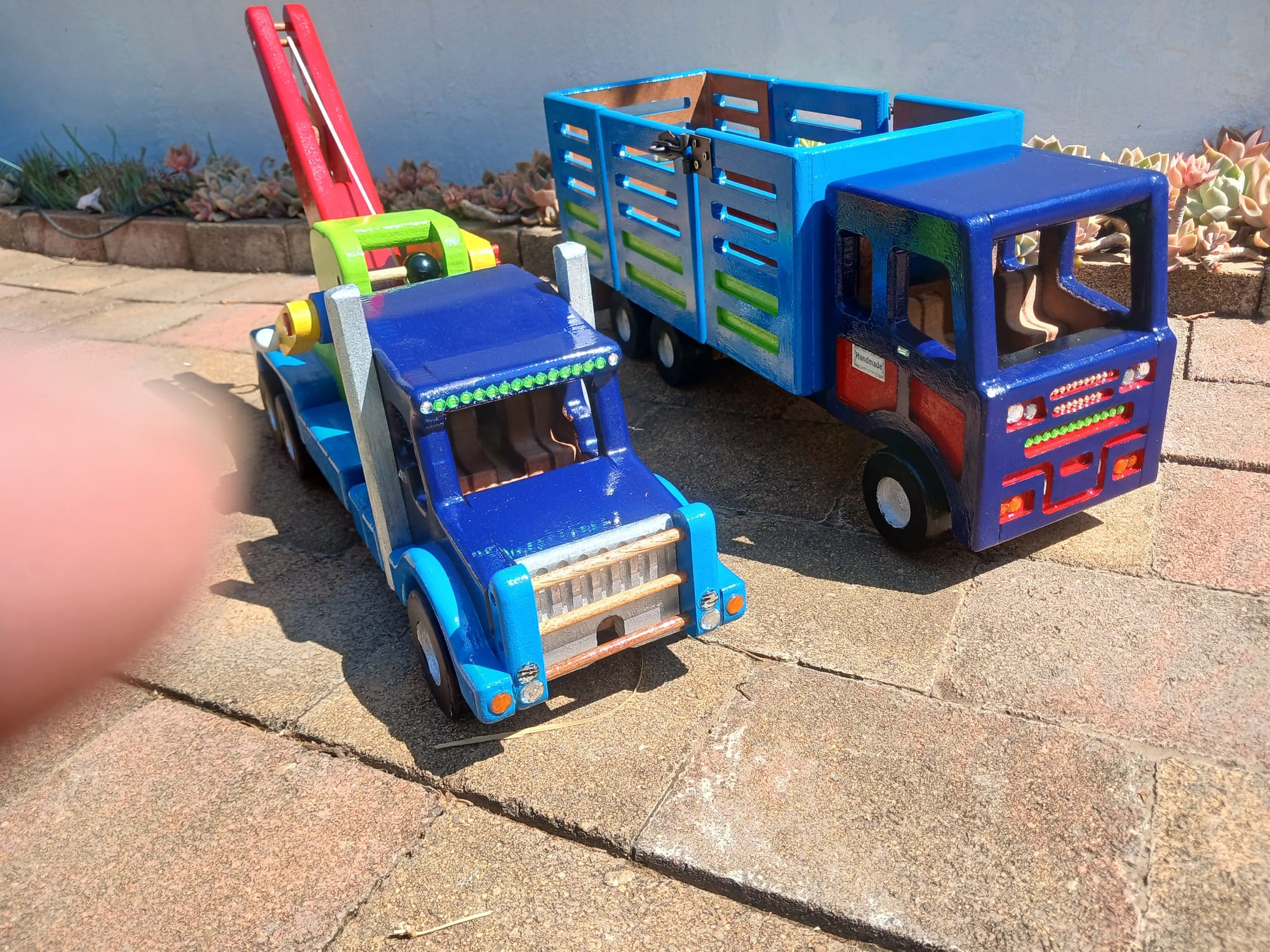Hand made and painted wooden toy trucks and cars Kindly contact us on WhatsApp for order or an appointment or viewing - 082 780 6010